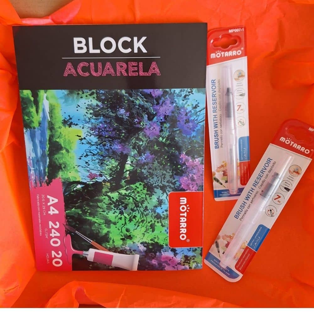 Todo lo que necesitas para sumergirte en el mundo de la acuarela: pinturas, pinceles, paleta, block de papel grueso y accesorios para mantener tu espacio de trabajo limpio y